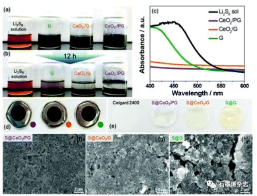 Fig. 7 CeO2/PG復合材料對多硫化物的吸附能力。(a, b)添加CeO2/PG、CeO2/G、G后Li2S6溶液的顏色變化,(c) 吸附Li2S6 12小時后的UV曲線, (d, e) 1C循環100次后電極和隔膜的數碼照片,(f, g, h) S@CeO2/PG、S@CeO2/ g和S@G循環后電極的SEM圖。