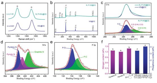 Figure 2. VG-CC 和N, P-VG@CC的a) Raman圖,b)XPS譜,f) N, P-VG@CC中N,P原子含量圖。