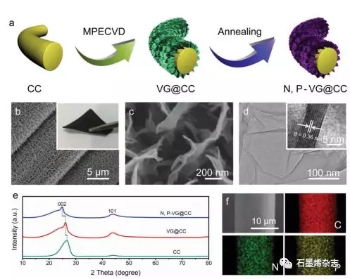 Figure 1. N, P-VG@CC的 a) 合成方法示意圖,b)低倍SEM圖,c)高倍SEM圖,d)TEM圖和f) C,N,P的元素映射圖。(b)和(d)中的插圖為 N, P-VG@CC的數碼照片和對應的HRTEM圖像。e) CC, VG@CC, 和N, P-VG@CC 的XRD圖譜。