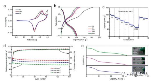 Figure 5. 柔性KPB//N, P-VG@CC全電池的電化學性能。a)掃描速率為0.1 mV s-1下的CV曲線;b)電流密度為 100 mA g-1下的恒電流充放電曲線;不同電流密度下的c)倍率和d)循環性能;e)電流密度為 100 mA g-1下的恒流放電平臺。