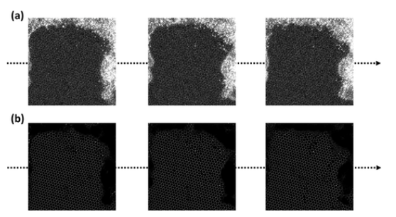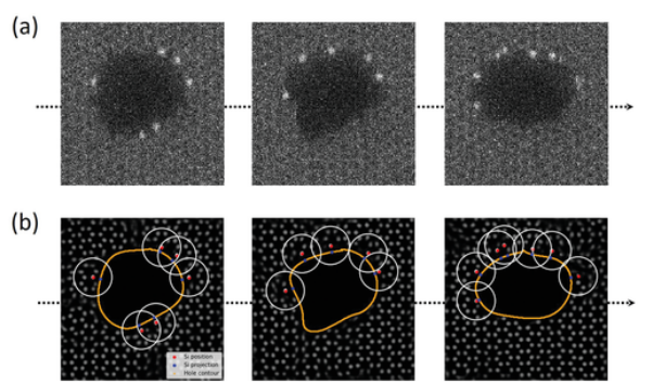 Figure 1 含Si雜質的石墨烯納米孔的STEM實驗數據。a)單個電影幀在單層石墨烯的納米孔邊緣顯示出Si雜質(亮點)。b) (a)中數據的深度神經網絡輸出。