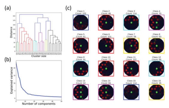 Figure 2 以Si雜質為中心的提取子圖像進行統計分析。a)層次聚類分析結果(沃德方法)。b)主成分分析的Scree圖。c)基于高斯混合模型的圖像堆棧分解為16個分量的結果。