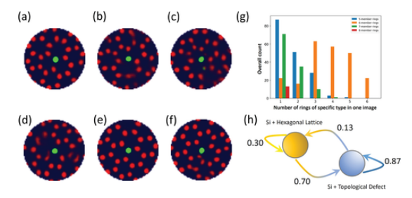 Figure 5分析石墨烯內部的硅雜質構型。a-f)塊狀石墨烯中Si雜質的一些構型示例。g)特定類型環的出現統計。h)耦合到拓撲缺陷的硅狀態和沒有這種耦合狀態之間的馬爾可夫躍遷示意圖。