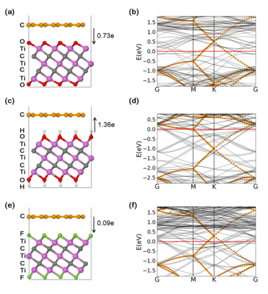 2,這導致單層石墨烯和單層MXene異質結構中石墨烯帶的狄拉克點移動。在雙層石墨烯和單層MXene的異質結構中,界面破壞了雙層石墨烯的對稱性;在AB堆疊雙層的情況下,電子轉移會產生界面電場,從而在K點處打開石墨烯帶中的間隙。這種內部極化增強了兩個石墨烯層之間的界面粘附力和內聚力。MXene-石墨烯-MXene和石墨烯-MXene-石墨烯夾心結構表現為兩個鏡像對稱的MXene-石墨烯界面。我們的第一性原理研究提供了對典型MXene和石墨烯之間相互作用的全面理解。