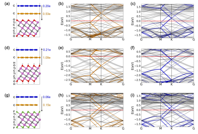 2(T = O、OH、F;端基)和石墨烯的各種異質結構。我們發現這些異質結構的粘附能、電荷轉移和能帶結構不僅對表面官能團敏感,而且對堆積順序敏感。由于其與石墨烯的功函數差異最大,因此Ti