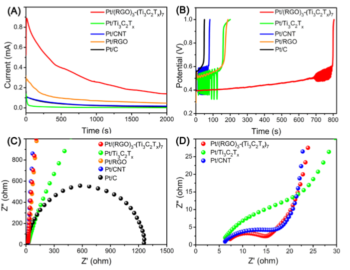 x體系結(jié)構(gòu)對(duì)甲醇電氧化的長(zhǎng)期電催化穩(wěn)定性、毒物耐受性和電子傳導(dǎo)性:(A)在0.5 V下測(cè)得的計(jì)時(shí)電流響應(yīng);(B)Pt/(RGO)