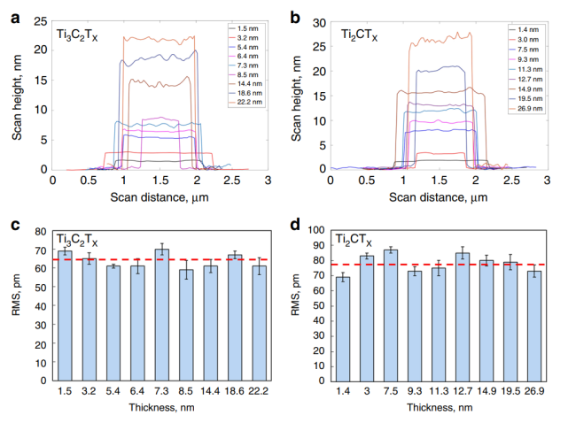 x膜的AFM線掃描(a,b)和相應的RMS值(c,d)