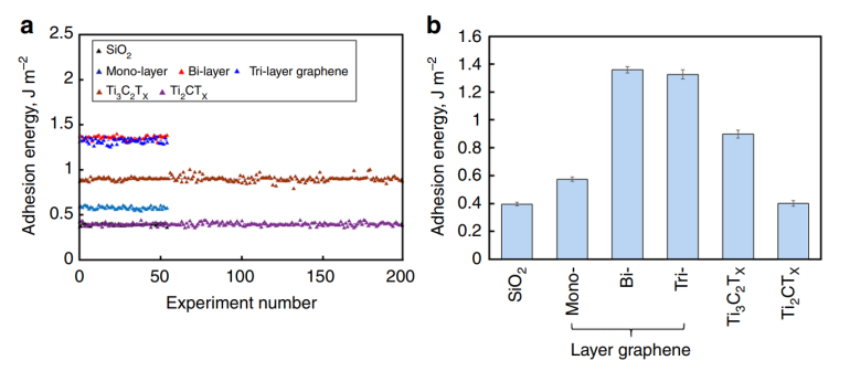 2涂層的硅球形尖端的附著力。應用Maugis-Dugdale理論,同時考慮了表面粗糙度,將AFM測得的粘附力轉換為粘附能。將獲得的粘附能與單層、雙層和三層石墨烯以及SiO