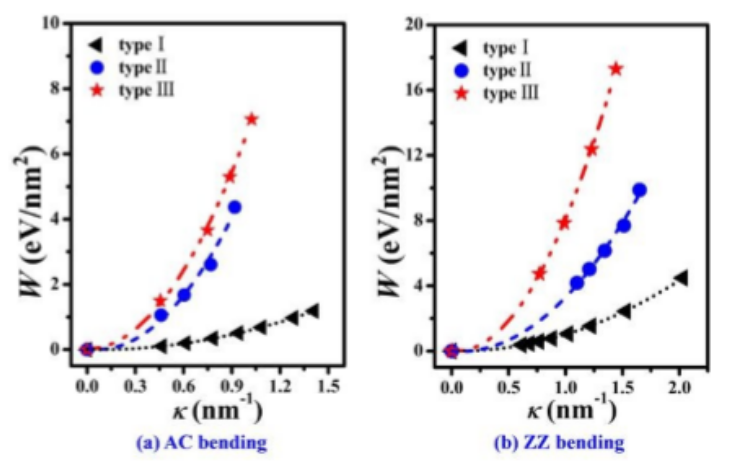 Fig. 2 應變能密度W和曲率κ的函數是彎曲GO在(a) AC和(b) ZZ方向上的四重擬合。