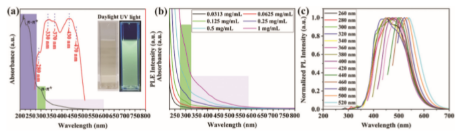 Fig. 1 (a) 520nm發射的GQDs的吸收和多重譜圖;(b)不同濃度GQDs溶液的吸收光譜;(c) GQDs水溶液的PL光譜作為激發波長的函數。
