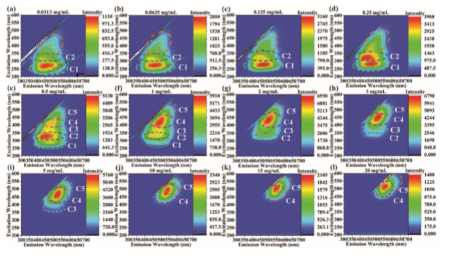 Fig. 4 不同濃度GQD溶液的三維熒光光譜分析。