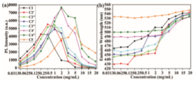 盡管人們做了很多研究,但石墨烯量子點(GQDs)中多色光致發光(PL)的機理仍存在爭議。深入了解GQDs中多色發射的起源對于調節其發光是非常必要的,這樣能更好利用這種熒光材料。在此,合成了具有氨基,羧基和羧酸銨基團的GQDs。制備的GQDs具有激發和濃度相關的多色PL特性。通過調節激發波長或GQDs的濃度,可以得到特定的發光顏色,包括藍色、青色、綠色、黃色,甚至橙色。系統結構和光學研究表明,石墨烯基平面和不同的官能團主要顯示nN 2P–σ*, π–π*, nO 2p–π*(–COOH), nO 2p–π*(–COO−)和nN 2p–π*電子轉換,表現為多熒光中心,產生了依賴于激發的多色PL。pH-dependent PL測量證明了不同類型的電子躍遷及其顏色發射。此外,系統的光學和形態學分析表明,隨著濃度的增加,GQDs可以自組裝成不同形貌和尺寸的J型聚集體,所觀察到的與濃度相關的多色PL可以歸結為GQDs中聚集介導的能級重建。我們的發現進一步表明,各種熒光中心之間的競爭和自聚集過程主導了GQDs的發光性能。這項工作將有助于理解GQDs中激發和濃度相關的多色發射的起源,這對于拓寬GQDs的應用領域也具有很大的指導意義。