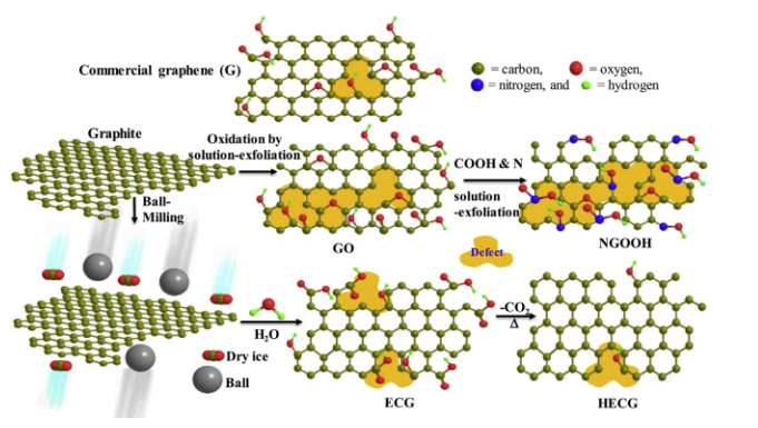這里,通過機械化學反應(或球磨法)在干冰條件下制備了邊緣羧基化石墨烯納米片(ECG),將其用作有效的電極材料用于超級電容器。與傳統溶液剝離石墨制得的氮摻雜羧基石墨烯(NGOOH)相比,該ECG有較高含量的邊緣羧基官能團,結構缺陷較少。ECG結構缺陷水平約為16.2%,而NGOOH高達48.9%。邊緣羧基化增加了石墨烯本身的電活性表面積,親水性和可潤濕性,且其內在特性不會遭受嚴重破壞,例如化學,機械和電子特性。該ECG可以在石墨烯孔內實現更有效的離子吸附和快速的電解質擴散,在1 A/g電流密度下,電容達到365.72 F/g,還具有良好的充電放電性能和倍率特性。而NGOOH的儲能性質顯著降低,電容只有175.05 F/g,這可能是因為NGOOH本身的高結構缺陷性影響其電學性質。