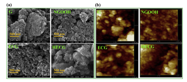 Figure 2. NGOOH,ECG,和HECG的(a)SEM圖和(b)AFM圖。