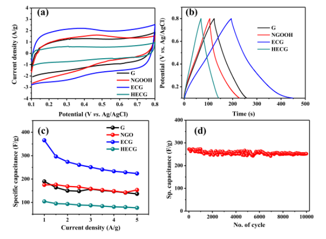 Figure 4.不同電極材料在1 M H2SO4電解液中的CVs曲線,掃速為20 mV s-1,(b)恒電流充放電曲線,電流密度為1 A g-1,(c)比電容與電流密度的關系,以評估倍率特性,(d)ECG的穩定性測試,在三電極體系中2 A g-1電流密度下循環10000圈。