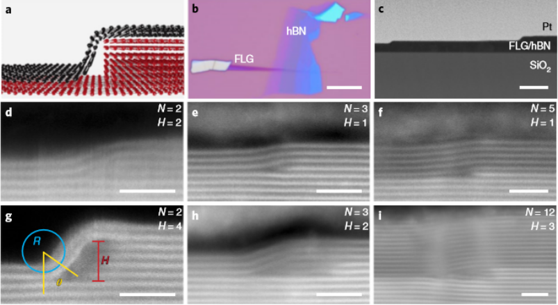 Fig. 1 在hBN臺階上制造彎曲FlG并進行STEM成像。a)異質結構示意圖。b)在hBN剝落片上傳輸的FLG光學圖像。c)橫截面階梯結構的低倍放大ADF-STEM圖像。d–i)在H層厚的hBN臺階上的N層石墨烯的ADF-STEM圖像。