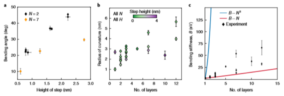 Fig. 2 從STEM圖像測量彎曲剛度。a)兩層和七層石墨烯的彎曲角度與臺階高度H的關系圖。b)所有臺階高度和石墨烯厚度的曲率半徑與厚度的關系圖。c) FLG的彎曲剛度對厚度的實驗測量。