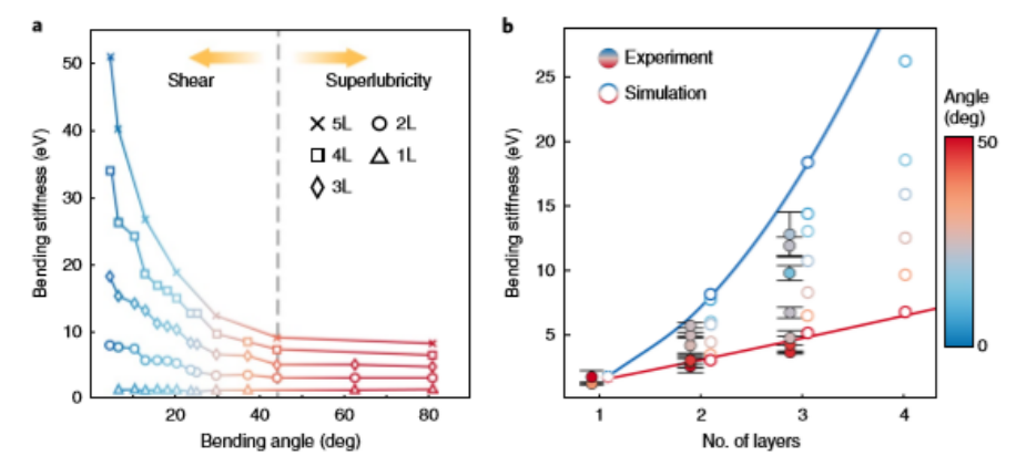 當材料接近原子長度標度時,連續尺度定律通常會失效,這反映了其基本物理學的變化以及獲得非常規性質的機會。這些連續極限在二維材料中很明顯,但對于其彎曲剛度或厚度如何縮放尚無共識。通過計算和電子顯微鏡實驗相結合,我們測量了石墨烯的抗彎剛度,得到單層石墨烯的抗彎剛度為1.2-1.7 eV。此外,我們發現,多層石墨烯的抗彎剛度隨彎曲角度的變化而急劇下降,三層石墨烯的抗彎剛度幾乎降低了400%。這種軟化是由于原子層之間的剪切,滑移和超潤滑性的出現而引起的,并且與標度功率從立方到線性的逐漸變化相對應。我們的結果為二維材料的彎曲提供了一個統一的模型,并表明在目前已知的最柔軟電子材料中,多層材料的柔軟度比之前認為的要柔軟幾個數量級。
