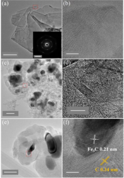 Fig. 2 TEM表征LSMCS電極的殼和芯組件。(a,b)從電極中提取的石墨烯殼的TEM圖像顯示出石墨層狀結構。(c,d)海綿碳核的TEM圖,包括相互連接的碳納米顆粒和皺折的石墨納米片。(e,f)碳納米顆粒的高倍TEM圖。