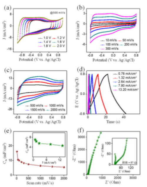 -1的各種掃描速率下,電極在1.6V電位窗口下的CV曲線。(d)在各種電流密度下電極的恒電流充放電曲線。(e)區域電容與掃描速率的關系。(f)電極的奈奎斯特圖
