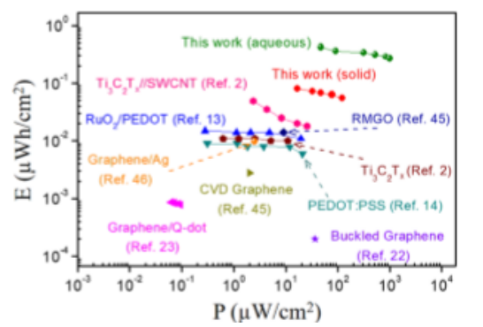 Fig. 5 各種透明SC器件的能量和功率密度。基于LSMCS電極的水、固態SC器件的Ragone圖以及與其他透明器件的比較。
