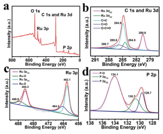 Figure 2. XPS分析。(a)Ru2P–rGO的XPS總譜,高分辨(b)C 1s和Ru 3d,(c)Ru 3p和(d)P 2p區域。