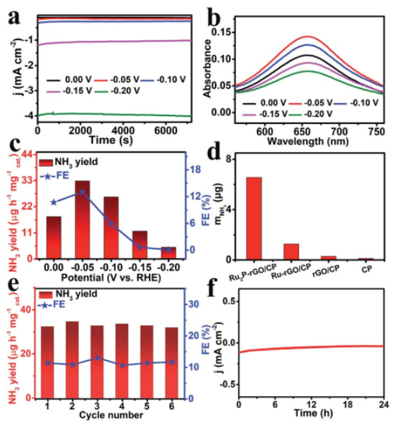 Figure 3.在N2飽和的 0.1 M HCl溶液中的電化學測試。(a)Ru2P–rGO/CP在不同電壓下的計時電流曲線,(b)在不同電壓電解測試2 h后電解液的UV-vis吸收光譜,(c)NH3產率及對應電壓下的法拉第效率,(d)不同電極的NH3產率比較,(e)循環測試6次,(f)長期電解測試(24 h)。