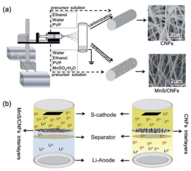Figure 1. (a)MnS/CNF和CNF的合成示意圖,(b)不同阻隔層抑制多硫聚合物的示意圖。