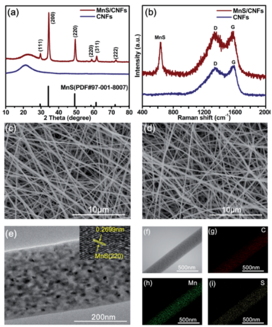 Figure 2. MnS/CNF和CNF阻隔層的(a)XRD 和(b)Raman譜,(c)MnS/CNF和(d)CNF的SEM圖,(e)MnS/CNF的TEM圖,插圖為HRTEM圖,(f-i)STEM圖以及相應的元素分布情況。