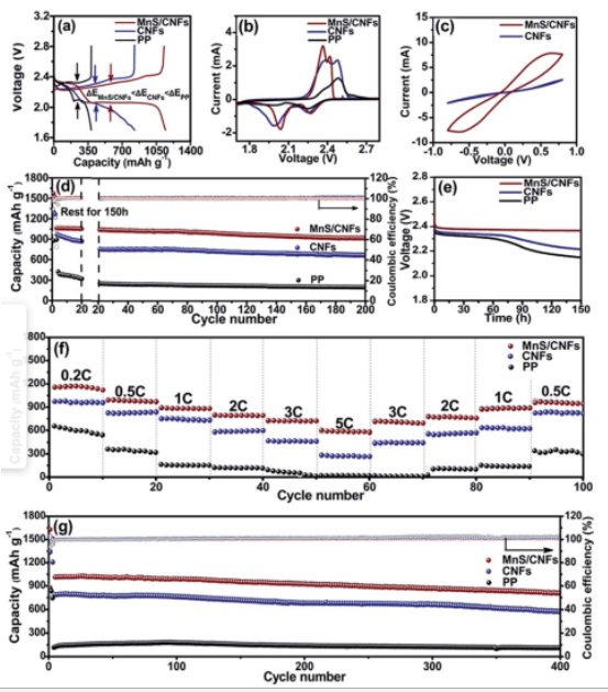 Figure 3.電化學表征。不同阻隔層(PP, CNF, MnS/CNF)的(a)恒電流充放電曲線,(b)CV曲線,電壓范圍1.7-2.8 V,(c)分別帶有CNF和MnS/CNF阻隔層的對稱型電池的CV曲線,(d)帶有不同阻隔層電池的循環性能測試,(e)開路電壓曲線,(f)倍率性能,(g)長時間的循環穩定性評估。