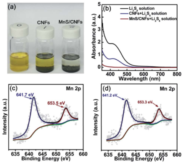 Figure 4. Li2S6溶液中分別加入CNF和MnS/CNF阻隔層的(a)光學照片和(b)UV-vis光譜,(c-d)MnS/CNF阻隔層在放電前后的高分辨Mn 2p XPS譜。