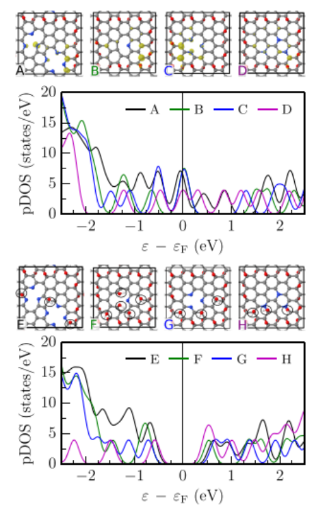 Figure 4. 在NrGO-2表面的理論計算模型,呈現(xiàn)了態(tài)密度曲線,DFT計算的重復結構單元(灰色, 紅色, 黃色, 和白色球分別代表 C, O, N, 和 H 原子)。