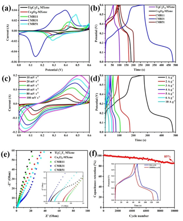 4-MXene、CMR11、CMR31和CMR51電極的CV曲線;b)在1 A/g的電流密度下測量的GCD曲線;c)在10到100 mV/s的不同掃描速率下CMR31電極的CV曲線;d)CMR31電極在1至10 A/g的不同電流密度下的GCD曲線;e)0.01 kHz至100 Hz頻率范圍內的EIS奈奎斯特圖;插圖顯示了在高頻范圍內的曲線圖;f)CMR31電極在10000次循環中的循環穩定性;插圖顯示了在第一個和第10000個周期獲得的CV曲線