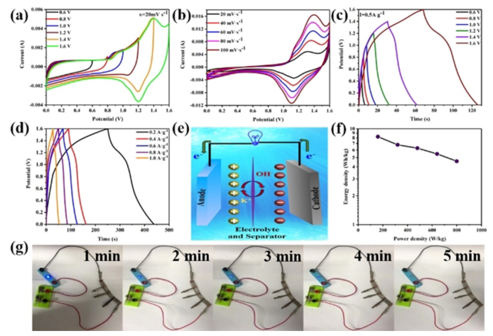 Figure 5. a)20mV/s的掃描速率,不同電勢窗的CV曲線;b)ASC在0–1.6 V的電位窗口中以不同掃描速率的CV曲線;c)GCD在不同電位窗口中的GCD曲線;d)在電位窗口0–1.6 V中,不同電流密度下ASC的GCD曲線;e)CMR31//AC ASC設備的示意圖;f)CMR31//AC ASC的Ragone圖;g)由串聯的四個全固態ASCs點亮LED指示器,在不同時間的亮度