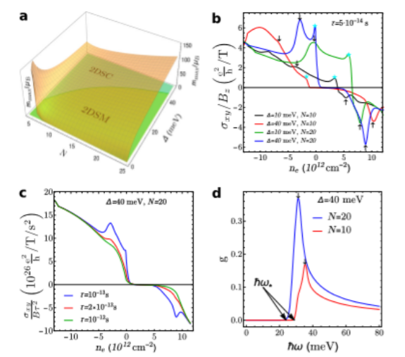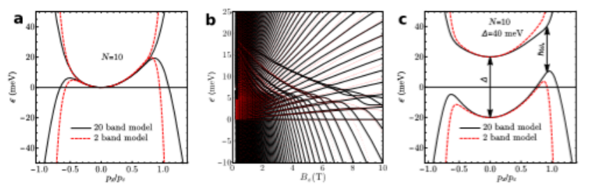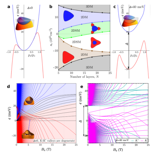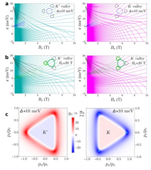 Fig. 7 a Landau能級(jí)譜是在Δ=5meV時(shí)垂直磁場(chǎng)Bz的函數(shù)。b 對(duì)于在K’/K處的Δ=5meV,繪制了B
