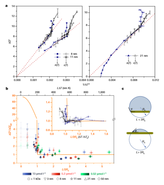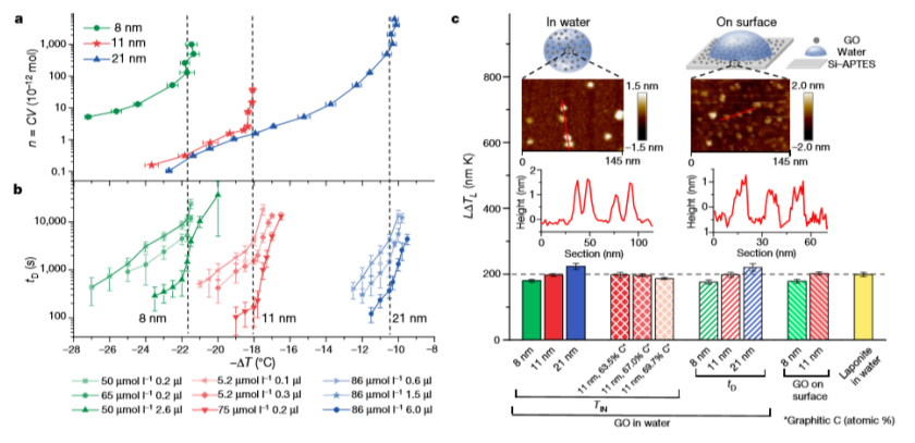水的凍結現象無處不在,并影響著氣候,化學工業,低溫生物學和材料科學等各個領域。冰的成核是水凍結過程中的關鍵步驟,近一個世紀以來,人們一直認為臨界冰核的形成是這一成核步驟的必要條件。但是,由于這種冰核轉瞬即逝和其納米性質,因此沒有直接的實驗證據可以證明這種冰核的存在。在這里,我們報道了在具有可控尺寸的氧化石墨烯納米片水滴中冰成核現象,并顯示只有在一定的尺寸以上才能對冰的成核有顯著的影響,該尺寸隨液滴的過冷程度而變化。根據實驗數據和理論計算推斷,氧化石墨烯的臨界尺寸反映了臨界冰核的大小,在足夠大的氧化石墨烯的情況下,臨界冰核位于其表面,并產生與經典成核理論一致的成冰行為。相反地,若氧化石墨烯的尺寸小于臨界冰核尺寸時,釘扎在氧化石墨烯的外圍會使冰核隨著其生長而變形。這為成核作用提供了更高的自由能壘,并抑制了氧化石墨烯的促進作用。這些結果提供了關于臨界冰核的存在和與溫度有關的尺寸的實驗信息,而這些以前僅在理論上和通過模擬進行了探索。由于將臨界前核固定在納米顆粒邊緣上并不是石墨烯氧化物上的冰核所特有的,因此我們希望該方法可以擴展到探測其他成核過程中的臨界核。