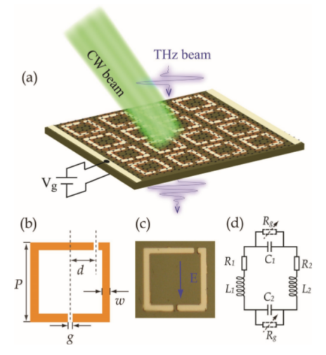 近年來,平面超材料因其在平面光學(xué)元件,超靈敏傳感器,激光濺射和非線性器件設(shè)計中的潛在應(yīng)用而被廣泛研究。最近的研究報道了通過光激發(fā)動態(tài)控制基于光敏材料的超材料。但是,以前的大多數(shù)演示都依賴于單個刺激控制,并且通常需要大的通量和超快的光脈沖。此處,石墨烯與硅基板上的Fano諧振超表面集成在一起,可通過低功率連續(xù)波(CW)光學(xué)激發(fā)(λ= 532 nm)提供對太赫茲波的有源調(diào)制。更重要的是,混合石墨烯-硅系統(tǒng)通過施加偏壓和CW照明對硅進行光摻雜實現(xiàn)“雙重控制”,從而改變了石墨烯的電導(dǎo)率,有效地調(diào)制了超材料的共振。具有共振超表面雙重控制特性的大型實時可調(diào)性可能是設(shè)計有源和功能太赫茲器件的有效途徑。