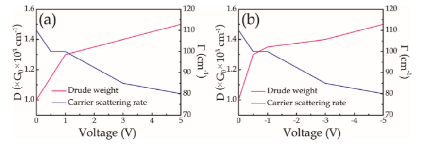 -2的光泵功率密度下,計算的Drude權(quán)重(粉紅色曲線)和載流子散射率(藍色曲線)與a)正偏置電壓和b)負(fù)偏置電壓的關(guān)系。