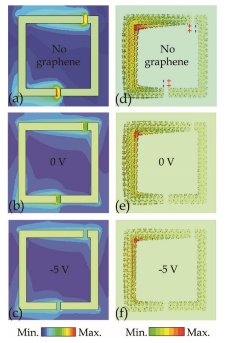 Figure 5. 模擬的電場和表面電流分布。在Fano共振頻率下a–c)絕對電場和d–f)表面電流的模擬分布.