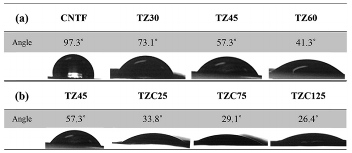 Figure 3. (a)原始CNTF、TZ30、TZ45、TZ60和(b)TZ45、TZC25、TZC75、TZC125光催化劑的接觸角