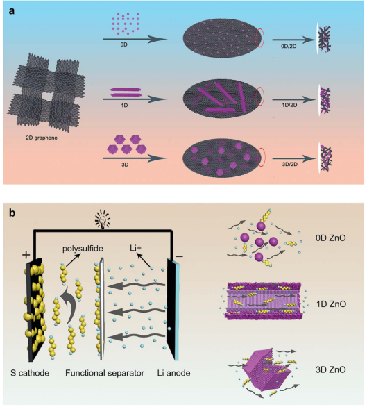 Figure 1. (a)功能隔膜的合成過程和(b)LSBs中不同ZnO/石墨烯功能隔膜的硫電池的工作機理示意圖