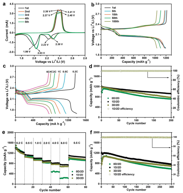 +/Li,硫//1D/2D在0.1 mV/s掃描速率下的循環伏安(CV)曲線;在1C的電流密度下,硫//1D/2D的(b)恒電流充電/放電曲線和(c)倍率性能;(d)循環性能(1C)、(e)倍率性能和(f)循環性能(2C)