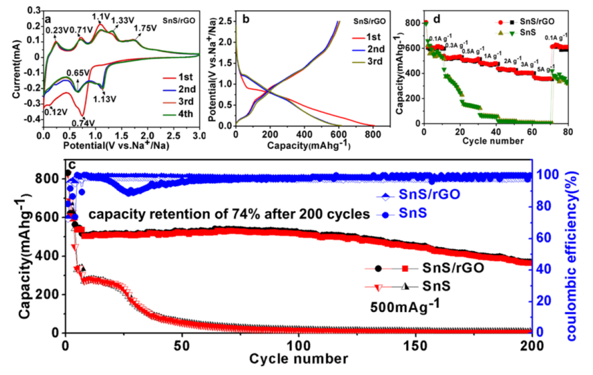 Figure 3. (a)SnS/rGO的CV曲線;(b)0.1 A/g下,最初三個循環中,SnS/rGO的恒電流放電/充電曲線;(c)SnS和SnS/rGO在0.5 A/g時的循環性能;(d)不同電流密度下SnS/rGO和SnS的倍率性能