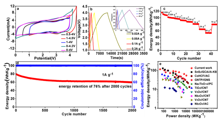 Figure 6. (a)AC//SnS/rGO SICs在不同電勢窗口下的CV曲線;(b)AC//SnS/rGO SIC設備的時間-電壓曲線;(c)AC//SnS/rGO SIC設備在不同電流密度下的倍率性能;(d)AC//SnS/rGO SIC設備的長期循環穩定性;(e)與以前的研究相比,SICs的Ragone圖