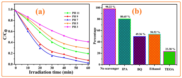 4-ZnO表現出最高的光分解活性,在可見光照射下,60分鐘內環丙沙星的分解效率達到98.4%。光生空穴在環丙沙星(CIP)的光催化分解中起主要作用。rGO-BiVO