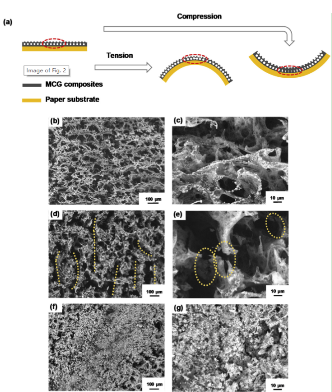 Figure 2. MCG/紙張傳感器的應變傳感工作機制:(a)MCG復合材料在拉伸和壓縮應變下多孔結構的示意圖;(b)和(c)中沒有施加應變、(d)和(e)中的拉伸應變下、(f)和(g)中的壓縮應變下,MCG復合材料的SEM圖