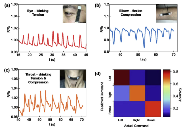 Figure 4. 演示為可穿戴應變傳感器,基于MCG的紙傳感器在檢測到以下情況時的電阻變化:(a)將傳感器安裝到眼睛的側面皮膚(插圖)來使眨眼動作大部分處于拉伸應變狀態;(b)將傳感器連接到肘部(插圖),使肘部的肌肉屈曲運動大部分處于壓縮應變;(c)通過將傳感器連接到喉嚨(插圖),在喉嚨上喝酒以產生拉伸和壓縮應變(主要是拉伸);(d)原型傳感器的機器學習結果,通過說出“左”、“右”和“旋轉”并帶有100個訓練數據,檢測出沒有真實聲音的喉嚨運動
