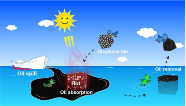 意外的原油泄漏于水面就可以破壞環境并引起經濟浩劫。為了減輕這類災難,在石油擴散之前及時進行干預以控制和回收石油至關重要。普通的親脂性吸附劑不起作用,因為原油太粘而無法流入其中,尤其是在寒冷的天氣下。這就提出了使用石墨烯泡沫的建議,該泡沫也是一種極好的親脂性吸附劑,因為它是一種導體并且可以被電加熱,從而使粗制流體足以吸收。然而,在公海上,電線、電源和電加熱任何物體顯然都是一個挑戰。在這里,我們提出了一種使用太陽能激活石墨烯瓦片的解決方案:在日光照射的幾秒鐘內,石墨烯瓦片升溫并吸收,最終將原油填充到自身體積的74%。它可以進一步用親脂性的滲油絕熱材料涂覆,成為吸光,保熱和吸油的黑洞。該瓦片能夠承受高達600℃的高溫,通過燃燒自身消除吸附的油,可以使其恢復活力,即使少量供應的瓦片也可以持續使用并在一段時間內防止漏油。可重復使用的瓦片是通過熱解相同尺寸和形狀的聚(偏二氯乙烯)泡沫制成的,密度為16 kg m