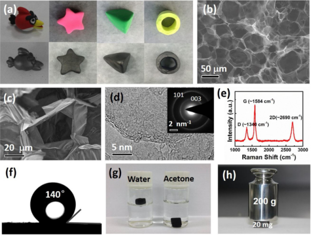 Fig. 2. 高分子粘土制成的石墨烯瓦片。(a)通過燒制相同尺寸和形狀的聚合粘土(上)獲得的石墨烯瓦片(下)。石墨瓦片的(b-c) SEM圖,(d)高分辨率TEM圖和選定區域的電子衍射圖及(e)拉曼光譜。(f)水與石墨烯瓦的接觸角。(g)石墨烯瓦漂浮在水面上,但在丙酮中下沉。(h) 20 mg石墨烯瓦支撐200 g重量。