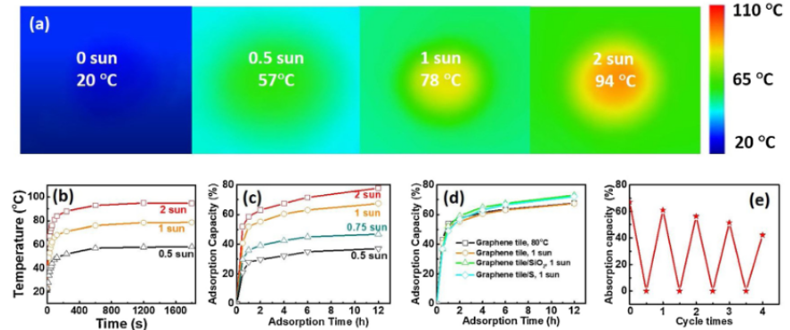 Fig. 4. 太陽能加熱和濕吸收石墨烯瓦片。(a)浸在原油中的瓦片在不同強度的模擬太陽照射下的熱圖像。(b)濕瓦在0.5-2日曬下表面溫度逐漸升高至穩態值。(c)在各種太陽照射下,瓦片對原油的體積吸收能力。(d)在1次太陽照射下,SiO